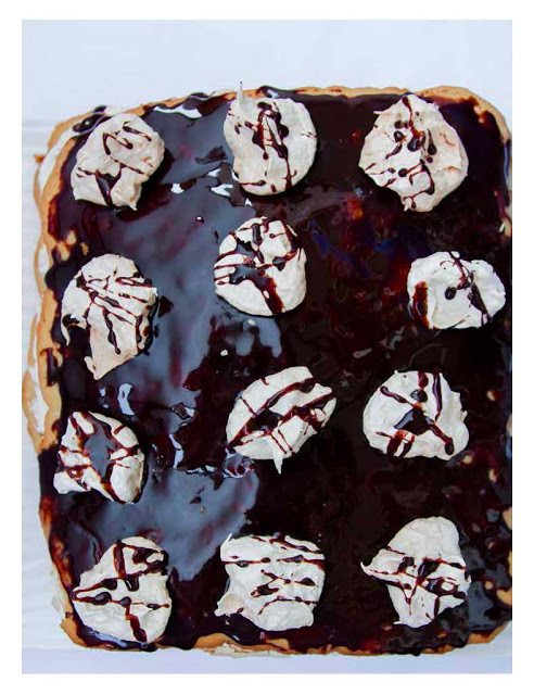 3. Для безе взбить 300 г сахара с яичными белками. Выложить белковую массу ровным слоем на противень и выпекать в разогретой до 200 °C духовке 30 минут.