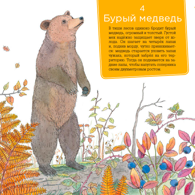 А каким живым языком написаны тексты! Читаешь и кажется, будто еще пару секунд — затрещит бурелом и на поляну выберется бурый мишка. В книге нет и сложных речевых конструкций. Всё просто и понятно для ребенка. Также есть много заметок про природу России, чтобы ребенок познакомился с тем, что окружает его каждый день.