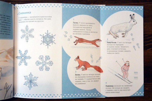 Рассматривая книги, ребенок заметит и смену времен года: вот по снегу бродит куропатка, весной распускаются васильки на горных лугах и ежи строят себе гнездо по осени. Это ещё один повод поговорить с малышом — закрепить знания о временах года и расширить кругозор.