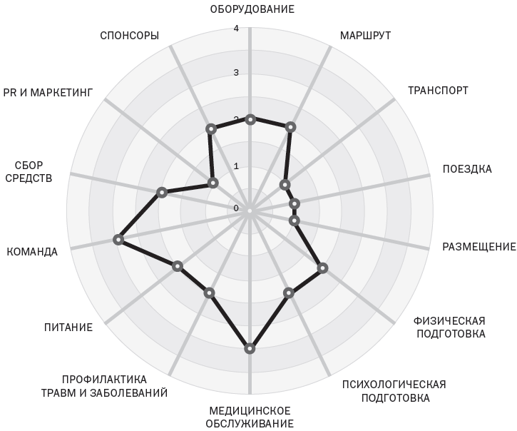 На начальной стадии развития каждой из составляющих успеха вы даете оценку всем элементам. Колесо успеха представляет графическую картину ваших слабых и сильных сторон и дает мгновенную визуальную обратную связь.Смысл работы с каждым элементом успеха состоит в том, чтобы принести позитивные изменения во все области. Некоторые ключевые составляющие, например физическое и психологическое состояние, потребуют постоянных изменений, тогда как другие, например маршрут, нуждаются только в непосредственном контроле в определенные моменты.