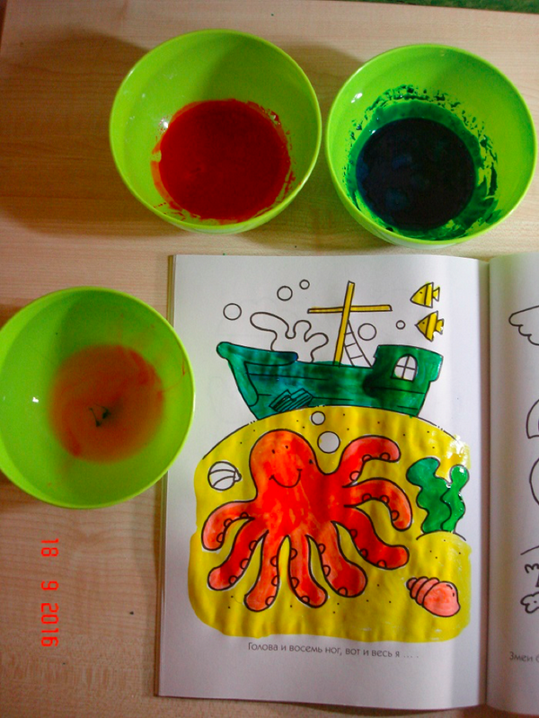 Для полного понимания будущего процесса лучше заранее (без детей) попробовать провести сделать все самостоятельно. Это займет немного времени, зато вы будете знать, как все пройдет. Мы провели пробный эксперимент: приготовили 3 краски, попробовали порисовать. И получили удовольствие от процесса 🙂