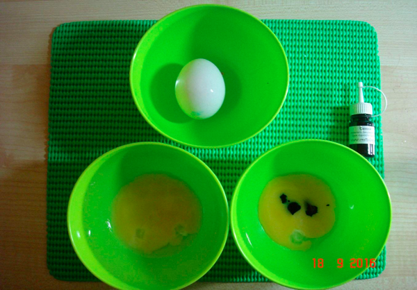 Если дети, участвующие в эксперименте, разные по возрасту, начинать лучше по разному сценарию. Когда дети уже могут контролировать свои реакции и спокойно наблюдать за действиями взрослого организатора — это вариант для полного сценария. В данном случае ребенок может сам разбивать яйцо, отделять желток от белка, капать пищевой краситель в яичный желток и т.д.