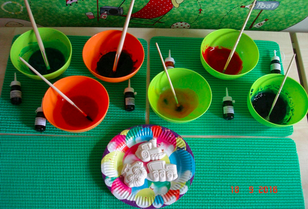Если в эксперименте участвуют два ребенка, материалов для раскрашивания должно быть с запасом. Лучше приготовить разные объемные материалы, которые можно брать в руки и раскрашивать. В нашем случае это были гипсовые фигурки, стаканчик из бамбука, бумажные детские тарелки, книжка-раскраска. Гипсовые фигурки мы сделали заранее, так как они должны были высохнуть.