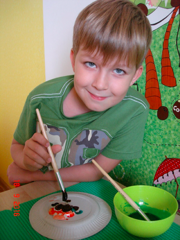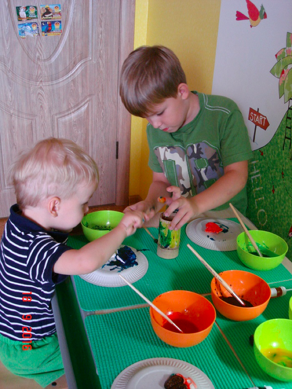Сначала мальчики брали каждый раз новую кисточку для каждого нового цвета (было шесть цветов и шесть кисточек). Потом это показалось утомительным занятием, и ребята стали макать одной кисточкой в разные емкости, что вызвало новый шквал положительных эмоций. Когда закончились гипсовые фигурки, Артем и Саша начали раскрашивать стаканчик из бамбука.