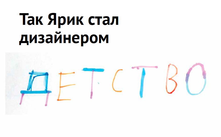 Каким квадрат может быть в детском логотипе? Первая мысль — нарисованным детской рукой. Виталик Бабаев попросил 9-летнего сына Ярослава написать слово «детство» — красками, фломастерами, карандашами. Просто посмотреть, что получится. Ярик любит наши книжки, поэтому старался. Получилось больше 10 больших листов, исписанных рукой ребенка.