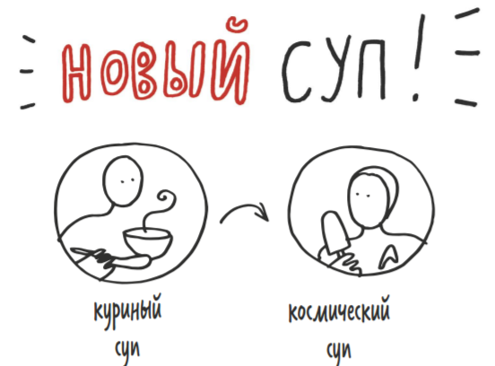 Воплотите решение в жизнь. Что если мы назовем суп космическим — таким, который можно есть на космической станции? Его легко хранить, плюс никаких капель, тарелок, суеты. Вдобавок он полезный.