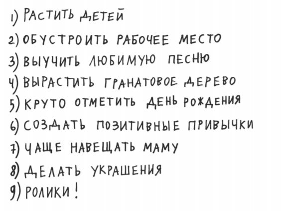 Еще одно упражнение на пять минут. Составьте список дел для жизни, которую вы любите. Если нам не хватает радости, ее следует активно добывать самим.
