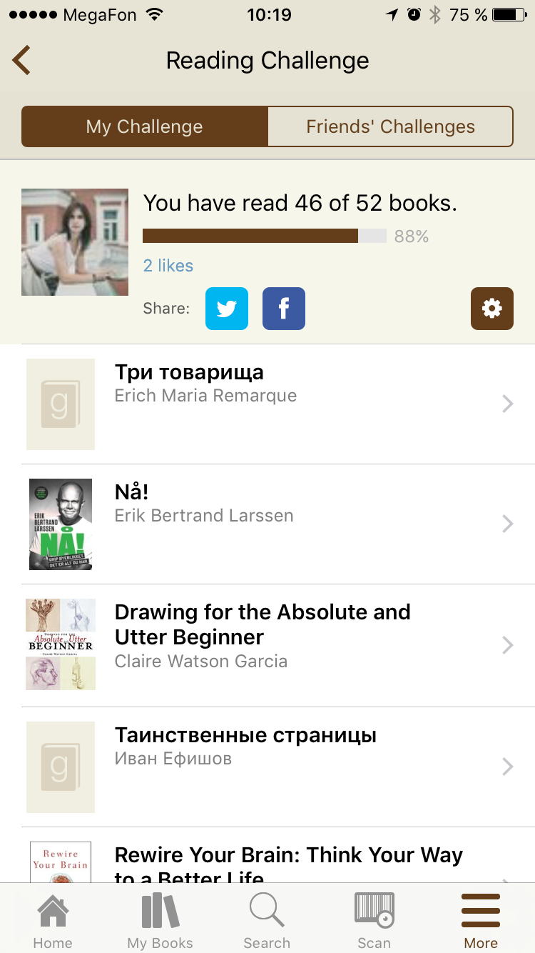 В приложении Гудридс можно задать количество книг, которые вы хотите прочитать за год. У меня на 2016 год установлен минимум в 52 книги. У приложения много люсов: во-первых, у вас есть четкая понятная цель, во-вторых, виден прогресс, в-третьих, можно отмечать все (ну почти все) прочитанные книги, ставить оценки и писать короткие отзывы, в-четвертых, смотреть, что читают и какие оценки ставят другие. Некоторых МИФовских книг на русском языке в приложении нет, но их можно добавлять самостоятельно.