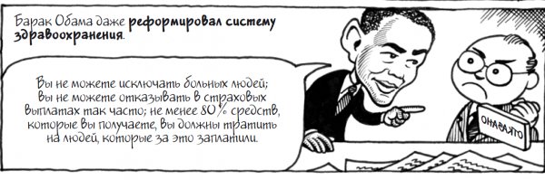 Барак Обама создал новые рабочие места, стал контролировать помощь от государства Уолл-стрит (те ей злоупотребляли, купаясь в деньгах налогоплательщиков) и даже навел порядок в страховых компаниях, которые отказывали людям в помощи, и те оставались без лечения. Теперь страховые должны были тратить 80% денег, которые получали от народа, а не оставлять чуть ли не всё себе. Люди, которые раньше не могли себе позволить медицинскую страховку (а значит, и лечение) теперь ее приобрели.