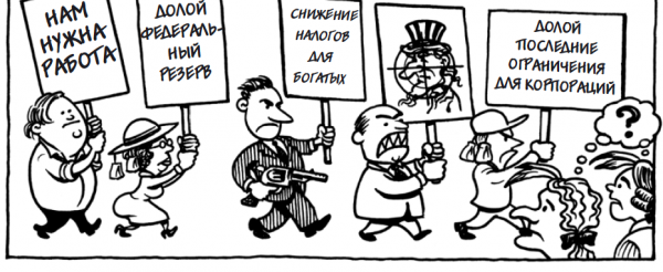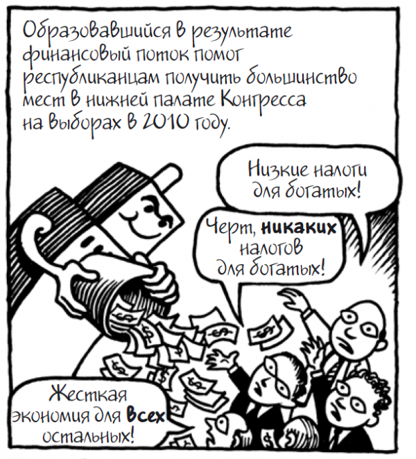 А корпорации меж тем искали лазейки для себя. И находили. В январе 2010 Верховный суд отменил введенные с таким трудом ограничения на влияние корпораций в политической сфере. Итог — на выборах республиканцы получили больше мест в Конгрессе и стали наводить свои порядки. Не в пользу народа. Они не стремились устранять реальные причины дефицита бюджета. Зачем, если деньги к тебе текут рекой?