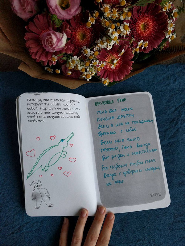Задания и вопросы в блокноте разнообразны, и не все они только про радость. Есть те, в которых надо нарисовать себя грустного или описать человека, который разбил ваше сердце. В этом есть полнота жизни и целостность.