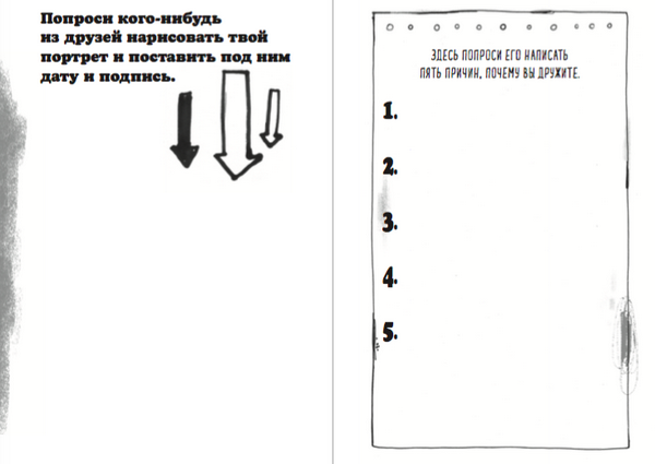 В блокноте есть страницы, предназначенные для друзей. Например, на этом развороте надо попросить друга нарисовать ваш портрет и записать 5 причин, почему вы дружите.
