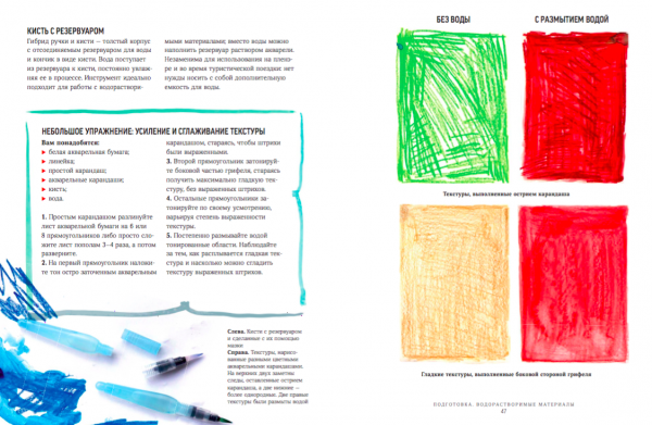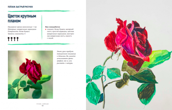 Первая половина книги посвящена основам живописи, композиции, цвету, а вторая содержит пошаговые уроки. Целых 18 штук! От простейшей угольной апельсинки до человека в движении и городского пейзажа акварелью. Не пугайтесь, много материалов не понадобится, а вот желание экспериментировать с формой, линией и сочетанием цветов акварели или карандашей — да 🙂