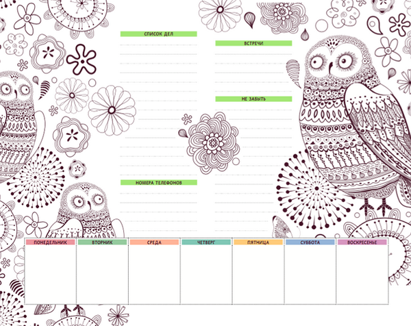 Структура планинга такая же, как в Изумительных садах. Есть место для списков и есть отдельный квадрат для каждого дня недели.