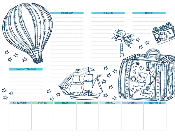 Тут есть и контуры архитектурных достопримечательностей, и самолеты с чемоданами, и экзотические животные с птицами, и корабли с воздушными шарами. Этот планинг настраивает на мечтательный лад. Но ведь только из мечты может родиться что-то прекрасное.