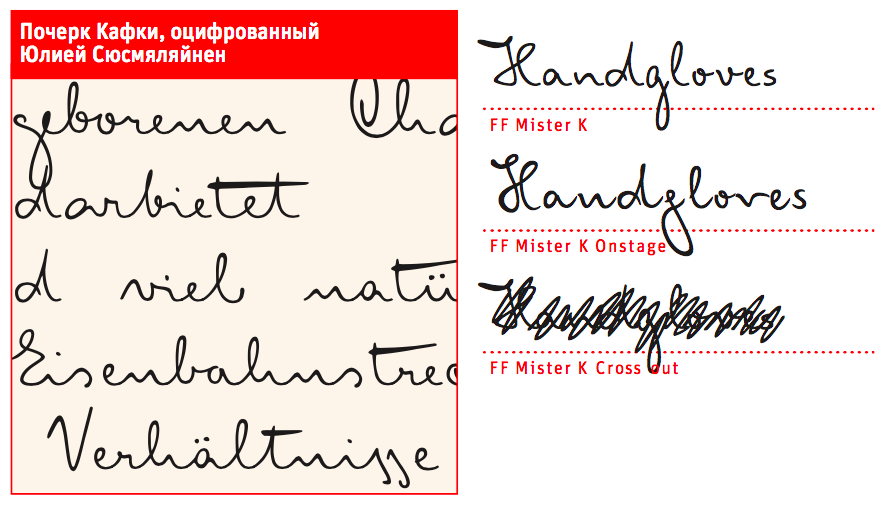 Рукописи последнего были довольно неразборчивы, но это не остановило Юлию Сюсмяляйнен — она разработала шрифт Mr. K — по почерку Кафки — со всеми несовершенствами, которых писатель, вероятно, хотел бы избежать.