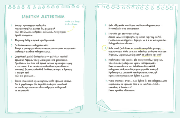 Ю: Еще в конце детективной истории есть подсказки для начинающих детективов, оформленные в виде заметок Колмогорского. Не готовые ответы, а наводящие вопросы, поводы для размышления. А вот отгадки в комплекте нет.