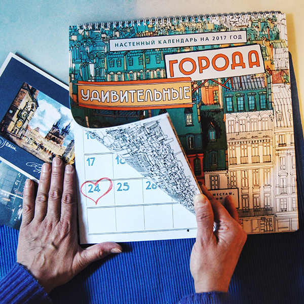«Всегда мечтала о календаре с городами, которые посетила или планирую посетить. Чтобы можно было его самой раскрасить акварелью. Чтобы бумага была плотная, иллюстрации интересные и необычные, удобно было вешать на стену… Как же здорово, что под новый год мечта исполнилась: издали календарь мечты! Германия, Англия, Япония, Канада… Каждый день этот календарь будет напоминать мне не сидеть на месте, а каждый месяц будет начинаться с новой традиции: раскрасить разворот, подвести итоги и построить планы на следующий месяц»
