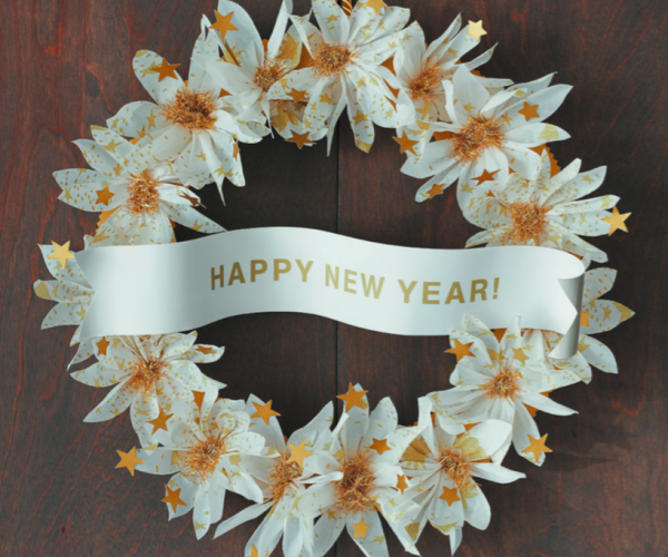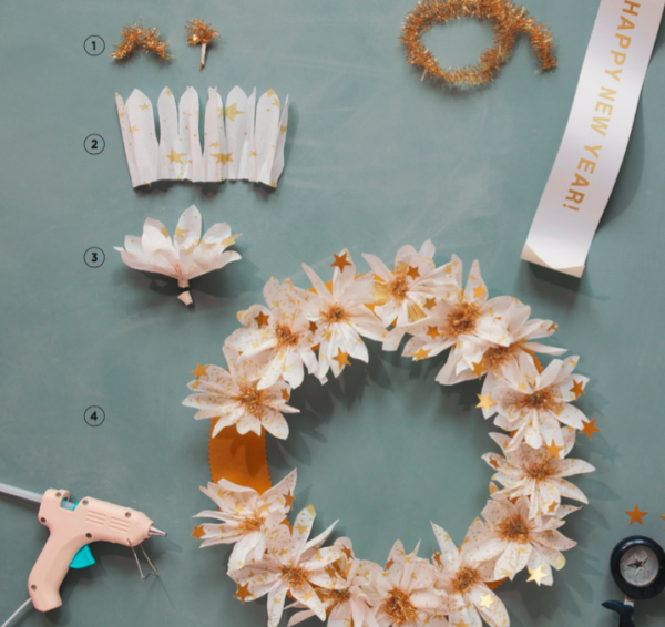 В книге «От листка к лепестку» есть прекрасный пошаговый мастер-класс по созданию нарядного венка из цветов и звезд своими руками. Это идеальное украшение для зимних праздников. Венок будет отлично выглядеть в сочетании серебра и белого. Вам понадобятся: креповая бумага или тишью с рисунком звезд, золотой картон, тонкая блестящая золотая лента, белая флористическая лента, клей ПВА.