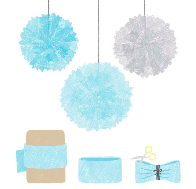 Разрежьте фатин (ткань-сеточка) на толстые полосы и намотайте их на большую книгу или кусок картона. Снимите ткань и перевяжите ее посередине. Разрежьте концы и придайте ткани форму помпона.
