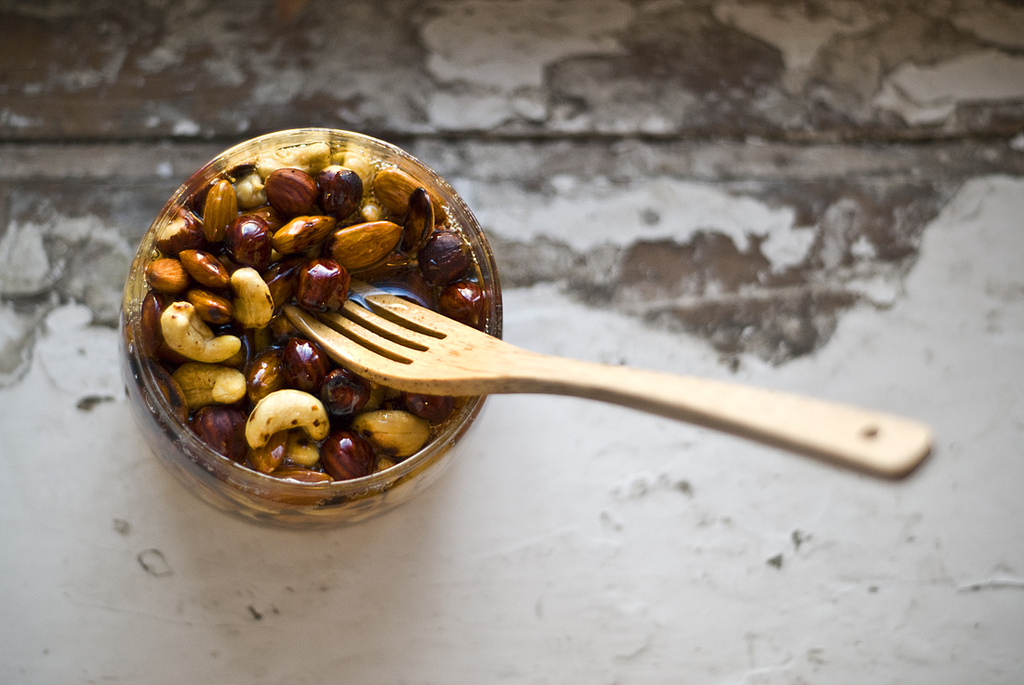 Совсем простой способ приготовить вкусный подарок — положить в банку орехи или смесь из орехов и сухофруктов (подходят любые ингредиенты: грецкие орехи, миндаль, кешью, изюм, курага, чернослив) и залить жидким медом. Попробуйте выложить слоями: слой орехов, слой меда, слой чернослива с курагой, слой меда.