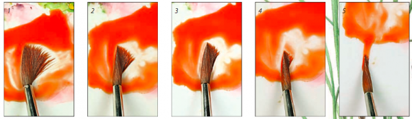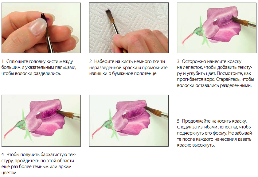 Старайтесь набирать краску на кисть одним плавным движением, используя всю ее головку. В процессе подкрутите кисть и потяните ручкой на себя (шаги 1–3). Это поможет сформировать заостренный кончик и одновременно набрать достаточно краски. Затем аккуратно вытяните кисть из замеса на себя (шаги 4–5). Перед тем как смешивать краски, убедитесь, что они достаточно мягкие, чтобы не испортить хорошую кисть.
