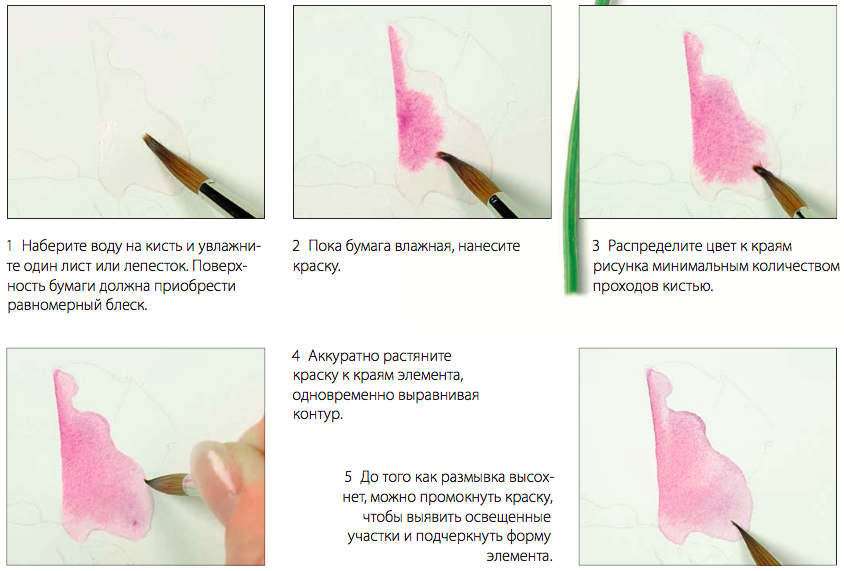 Чтобы получился мягкий равномерный цвет, предварительно увлажните бумагу водой. Это обеспечивает естественное растекание краски, прежде чем она начнет впитываться в бумагу, и дает дополнительное время для растяжки цвета (создания плавного перехода от одного цвета к другому) и промакивания бликов. Начните увлажнение с середины области, над которой собираетесь работать, и размывайте воду к краям. Повторите пару раз, чтобы убедиться, что бумага хорошо увлажнена. В этом случае края высохнут не так быстро. После того как вы равномерно распределили воду, проверьте, не осталось ли на поверхности бумаги «лужиц», и если они есть — промокните их влажной кистью.
