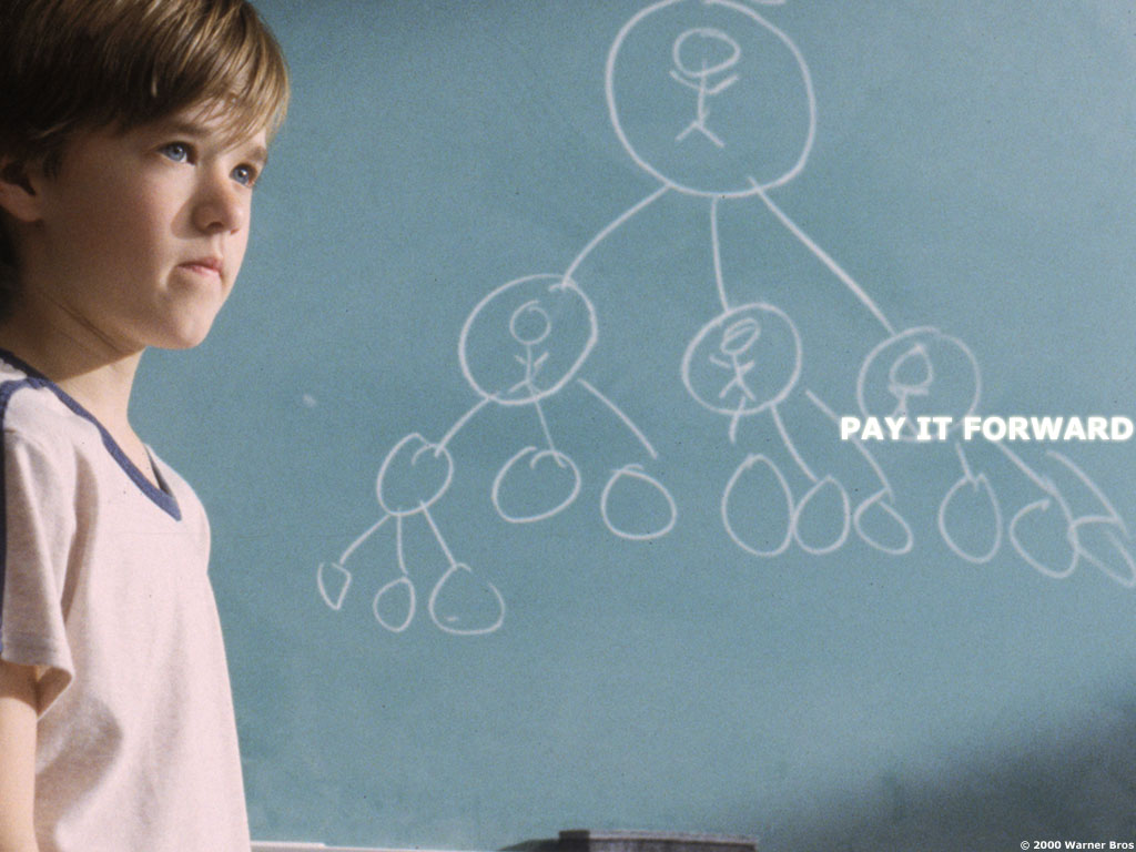В фильме «Заплати другому» школьный учитель просит учеников сделать доклад о том, как каждый из них мог бы изменить мир к лучшему. Один из них, Тревор, решает совершить три хороших поступка, три раза добровольно помочь случайно выбранным людям, а затем попросить их — вместо благодарности — трижды помочь кому-то еще и чтобы и они вместо благодарности попросили о том же самом, и так далее.