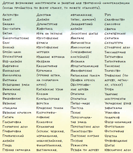 Определите приоритеты. Что нового вы узнали из этого списка о себе? Как бы изменилась ваша жизнь, если бы вы могли изучить что-то еще? Какой уровень владения навыком или искусством понадобился бы для этой перемены? Было бы достаточно азов? Уверенного владения? Или потребовалось бы совершенствоваться много лет? Может, вы были бы рады остаться любителем?