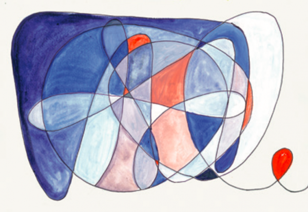 Абстракция — интересный и простой способ подготовки к работе над реалистичным произведением. Важно выбирать 3-4 цвета, которые вам нравятся, чтобы чувствовать эмоциональную связь с картиной. Нарисуйте простым карандашом непрерывную угловатую или округлую линию. Она может пересекаться несколько раз.