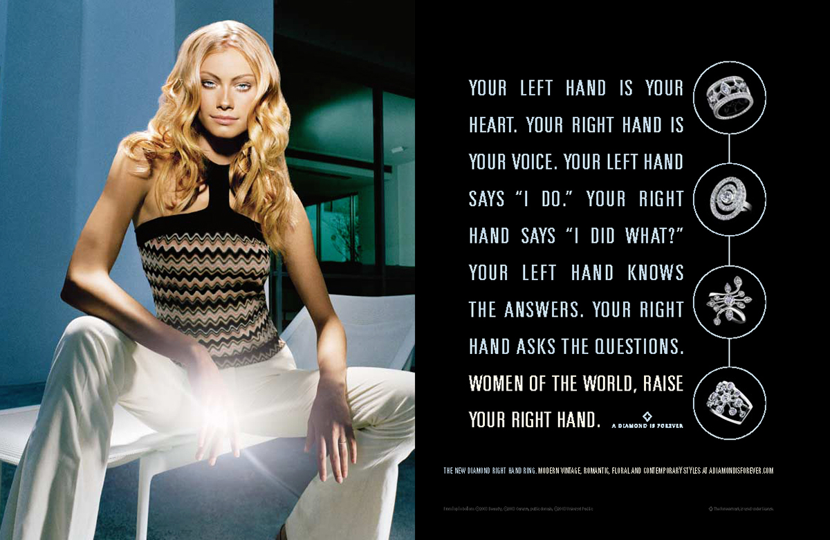 Когда международная ювелирная корпорация De Beers только запустила рекламную кампанию «Правая рука», предполагать, что женщины могут сами купить себе кольцо было почти табу. Причем у компании, которая сделала традицией мужчин покупать бриллиантовые обручальные кольца для своих невест. Корпорация нарушила свой собственный обычай и создала новое направление для торговли.