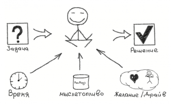 Дело в том, что у нас есть запас своеобразного ресурса — как называет его Максим «мыслетопливо» — необходимого для работы мышления. Вам знакомо чувство, когда «башка не варит» и «думать лень»? Вы сидите перед монитором, подперев голову рукой… Пустой взгляд блуждает где‐то за экраном, рот приоткрыт, а в черепной коробке как будто летает занудливая муха, и вы слышите ее жужжание: «бз‐з‐з»… Это и есть те самые моменты, когда запас мыслетоплива подошел к концу, а организм не успел его восполнить.