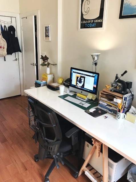 Я графический дизайнер, поэтому главное место всегда занимают компьютер и монитор, но мне также нужны мои любимые карандаши, блокноты, клейкие листочки и сканер. Я рисую все свои работы от руки, настоящим карандашом на настоящей бумаге, и я делаю это намеренно.