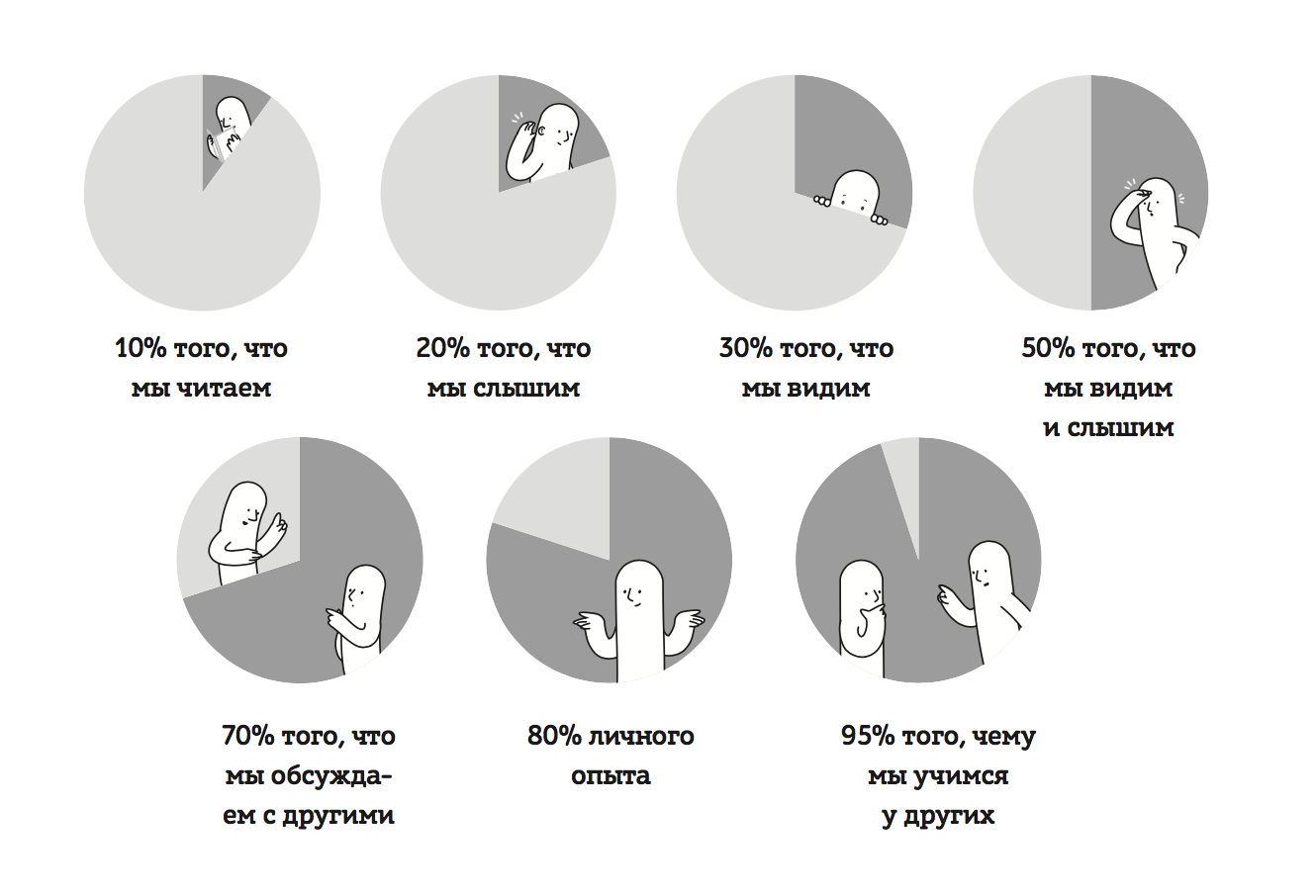 Это не точные цифры — они лишь призваны показать основополагающую идею: чем более вы вовлечены в процесс, тем лучше вы усваиваете и запоминаете информацию. Поэтому старайтесь принимать непосредственное участие в процессе, который хотите запомнить.