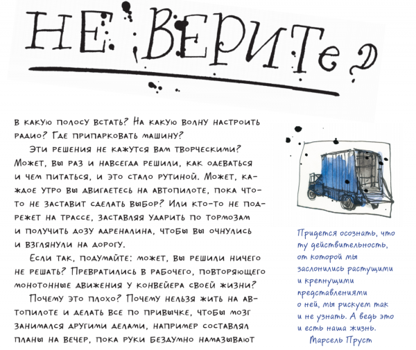 На обдумывание названия для русского издания мы не потратили много времени. Еще на первых страницах автор сравнивает творчество с вождением автомобиля — нужны навыки, но в принципе каждый может этому научиться. Не все станут шумахерами, но до дачи точно смогут доехать 🙂