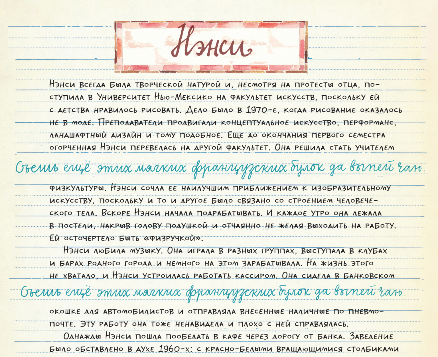 История про Нэнси была на подложке со странной надписью «The quick brown fox jumps over the lazy dog». Оказалось, что это английская фраза-панграмма, содержащая все буквы алфавита. Поэтому на русском мы использовали фразу: «Съешь ещё этих мягких французских булок да выпей чаю».