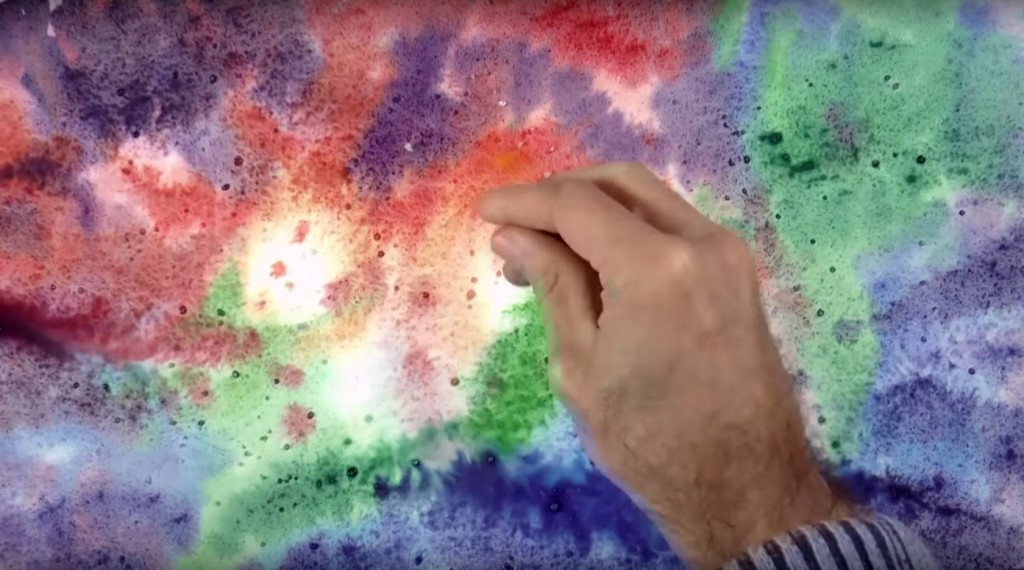 Когда вы закончите наносить краску и будете довольны сочетанием цветов и их яркостью, посыпьте на рисунок зерна крупной соли. Она впитает воду и заберет часть цвета, оставив красивые разводы в виде туманностей. Дождитесь полного высыхания и аккуратно соскоблите соль.