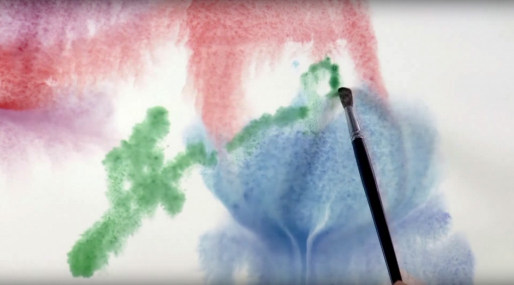 Разместите мольберт под небольшим углом и намочите водой всю бумагу чистой водой кистью-шваброй. Ей же в верхнем левом углу нанесите темно-красный и светло-красные цвета. Правый нижний угол закрасьте синим оттенком. Кисть № 8 нанесите зеленый оттенок по диагонали — из левого нижнего угла в верхний правый угол.