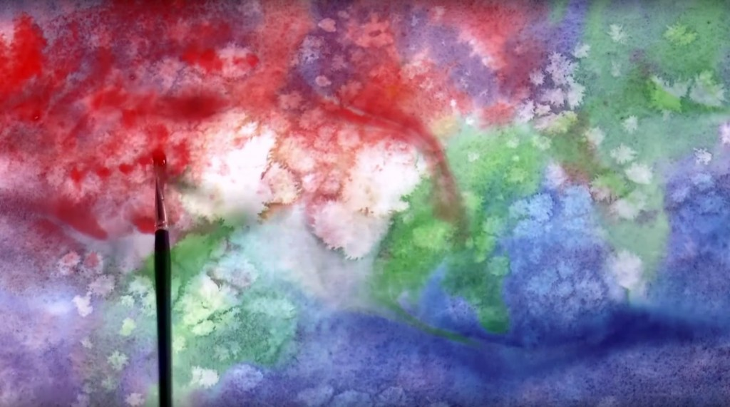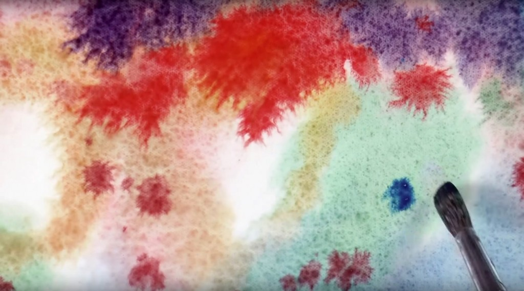 Работать нужно достаточно быстро, пока бумага еще влажная. Кистью № 4 усильте некоторые участки и заполнить все пробелы любой краской, какой вам захочется.