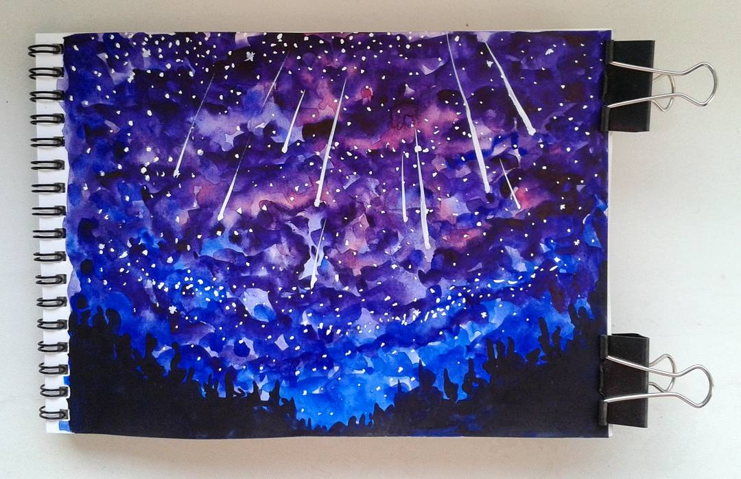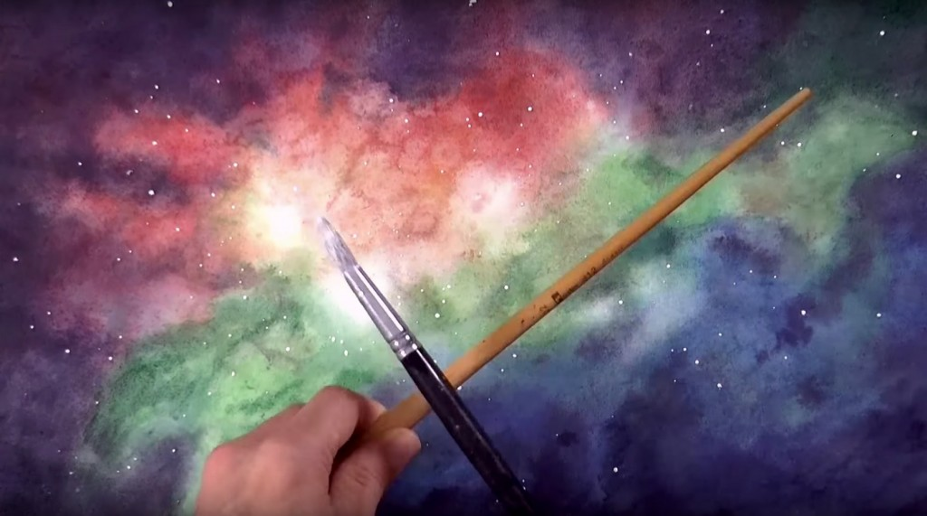 Дожидаемся полного высыхания и используем кисть № 2 для финальных штрихов. Чтобы добавить звезды в наш космос, положите мольберт на горизонтальную поверхность. Возьмите в не ведущую руку палочку (или другую кисточку) и держите ее параллельно бумаге. Наберите на кисточку в ведущей руке титановые белила и делайте легкие удары кистью о палочку так, чтобы крошечные белые частицы краски попадали на вашу картину. Добавьте «вручную» несколько звезд тонкой кистью № 0.