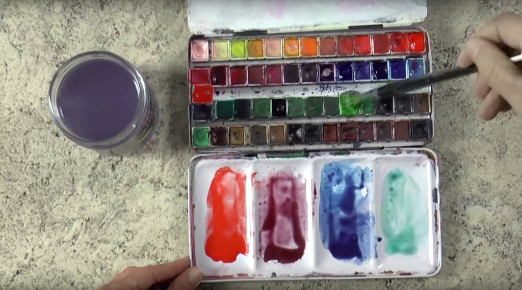 Закрепите акварельную бумагу на деревянной доске малярным скотчем. Смешайте оранжевый со светлым красным кадмием. Должен получиться светло-алый оттенок. Далее смешайте глубокий красный с марганцовой фиолетовой и каплей индиго, чтобы получить вишнево-красный оттенок. Потом добавьте делфте синий к индиго для получения темно-синего. И последняя смесь — прусский, перманентный и темный кобальт зеленый, фталоцианин, чтобы получить средне-зеленый.