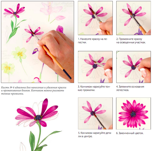 В книге описаны еще приемы работы с кистями № 2,6,8. При аккуратном обращении с кистями можно всю жизнь рисовать одним набором из четырех кистей.