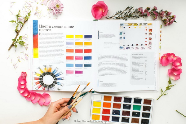 Эта книга как аппетитное пирожное — видишь его и сразу хочется откусить кусочек. Большая, с яркими разворотами и книжным «ароматом». Под обложкой — пошаговые инструкции, фишки художников, подсказки по выбору материалов и инструментов, работе с натуры и технике живописи.