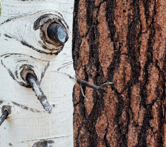 Заинтересовать зрителя может даже такой простой сюжет, как контраст текстур коры двух деревьев. На этом снимке гладкий ствол осины противопоставлен изрытой вертикальными бороздами коре сосны. Их наслаивание друг на друга и отсутствие фона усиливают контраст. Кажется, сосна ближе, чем осина, но это обман зрения. Глаз реагирует на красно-коричневый цвет, отчего создается впечатление, что этот ствол ближе. Фото из книги.