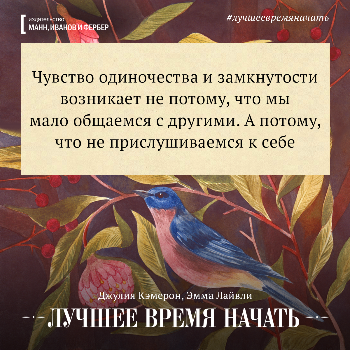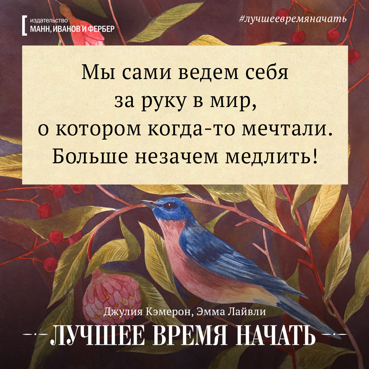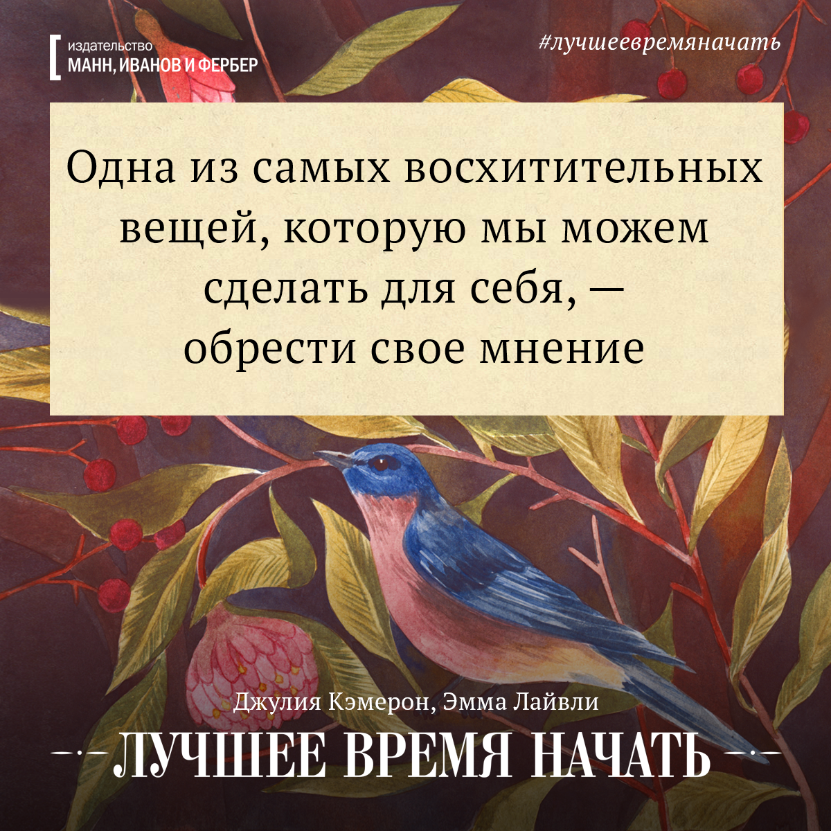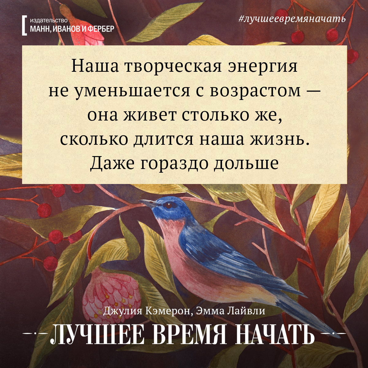 Пенсионный возраст вполне может быть самым богатым и насыщенным периодом жизни. Развитие творческой стороны личности помогает стать счастливее и уверенно ступить на новые, неизведанные земли. Об этом рассказывает эксперт по креативности Джулия Кэмерон в своей книге «Лучшее время начать». Мы выбрали несколько мудрых мыслей автора и сделали красивые открытки. Смотрите, вдохновляйтесь, делитесь со своими близкими.