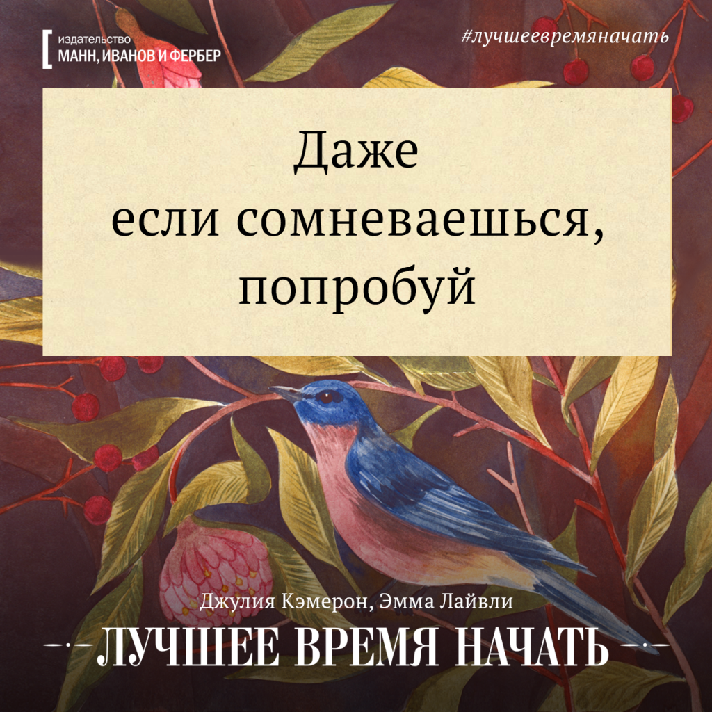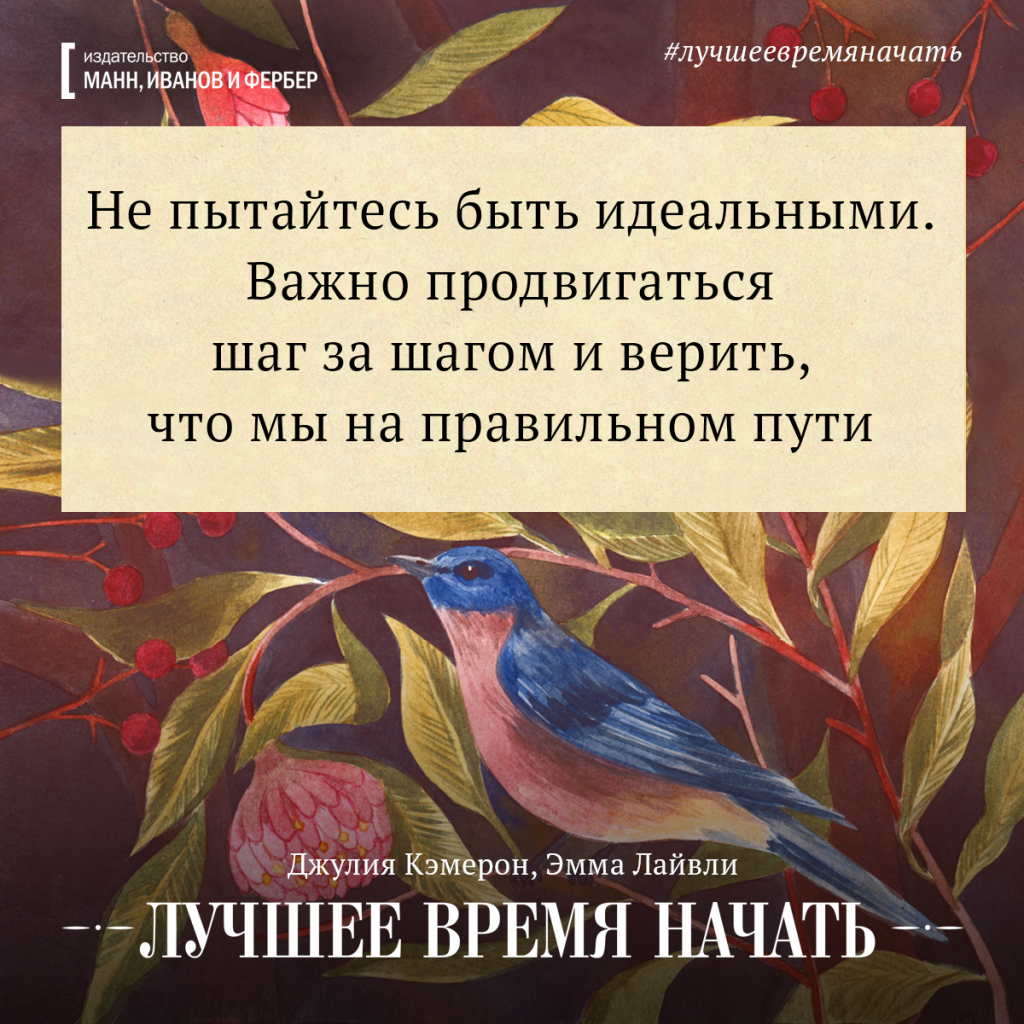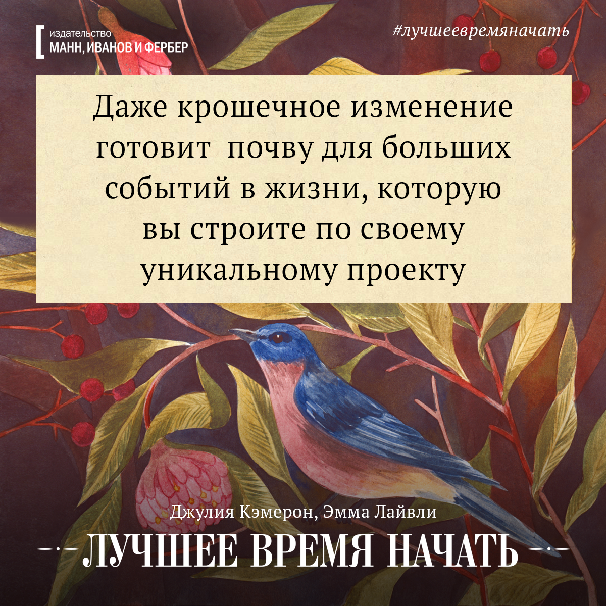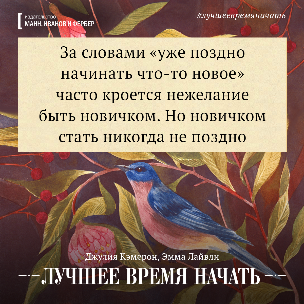 Пенсионный возраст вполне может быть самым богатым и насыщенным периодом жизни. Развитие творческой стороны личности помогает стать счастливее и уверенно ступить на новые, неизведанные земли. Об этом рассказывает эксперт по креативности Джулия Кэмерон в своей книге «Лучшее время начать». Мы выбрали несколько мудрых мыслей автора и сделали красивые открытки. Смотрите, вдохновляйтесь, делитесь со своими близкими.