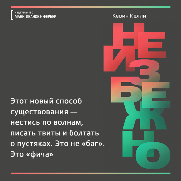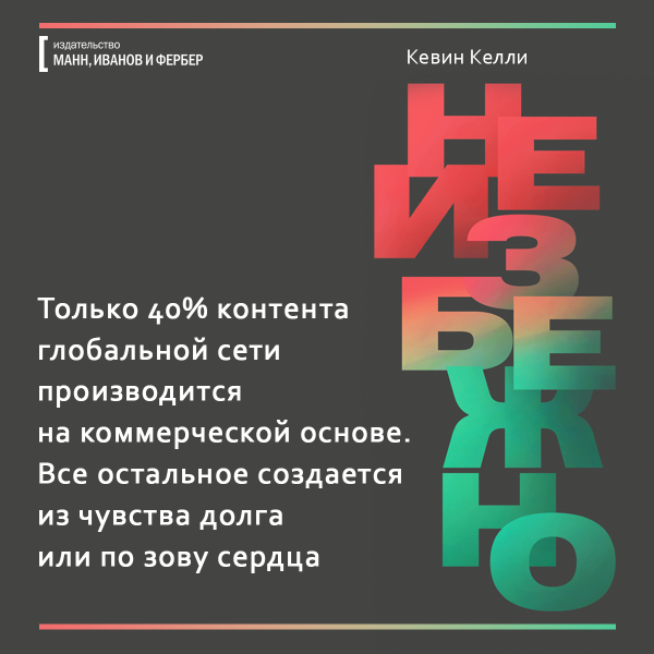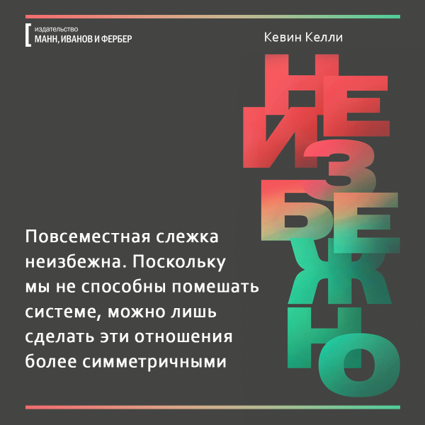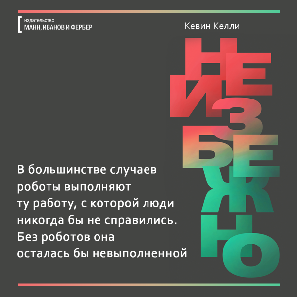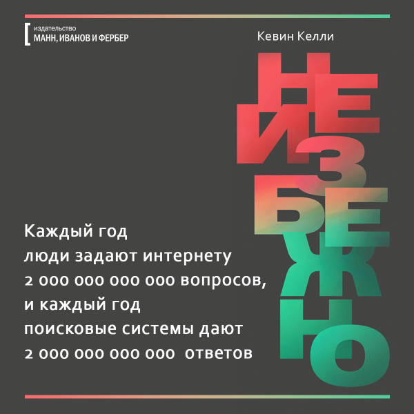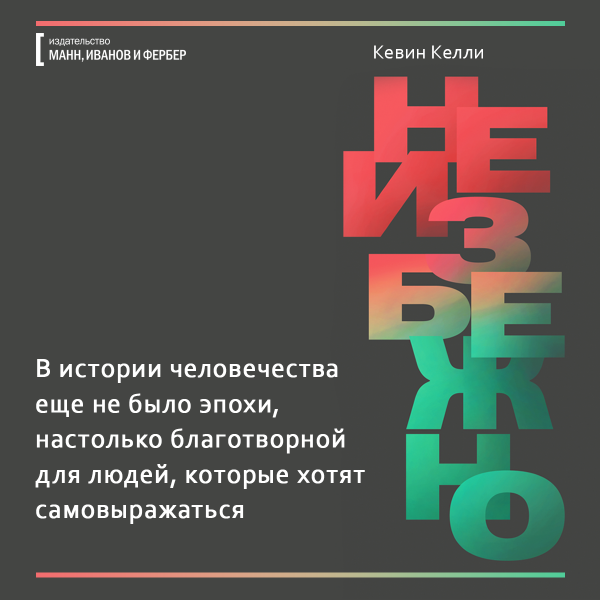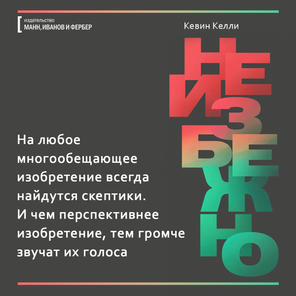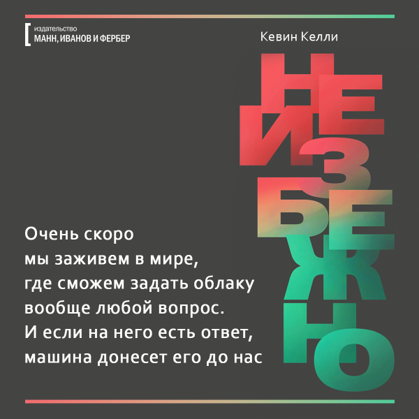 Какие фильмы мы будем смотреть — 3D или 8D? Где будем гулять — в виртуальной реальности или в гиперреальности, похожей на мир из «Матрицы»? Что будет уметь искусственный интеллект, учитывая что недавно чат-боты сами изобрели собственный язык? Обо всем этом рассказывает ведущий мыслитель современности Кевин Келли в книге «Неизбежно». Мы уже ее прочли и подготовили открытки, чтобы вы тоже могли заглянуть в будущее.