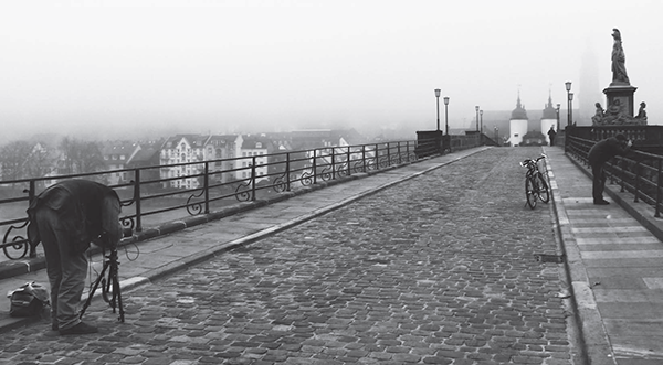 В это время современные строения скрыты под покровом тумана. Смещенная от центра перспектива делает снимок интереснее. Кадр выигрывает и за счет ключевых точек, которые уводят взгляд от фотографа к пешеходу в верхнем углу.