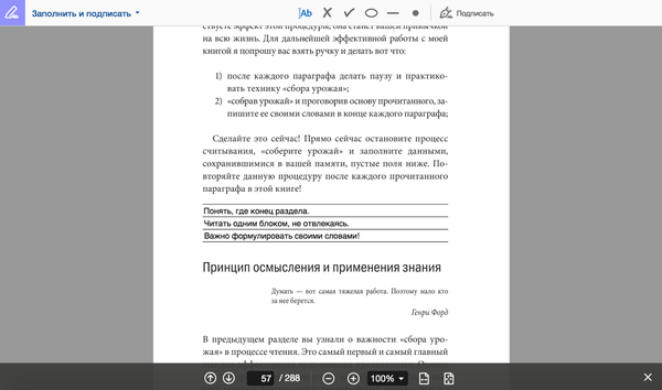 Возьмем для примера «Скорочтение на практике» Павла Палагина. Для запоминания прочитанного автор предлагает технику «Сбор урожая»: после каждого прочитанного параграфа нужно сделать паузу и сформулировать кратко своими словами суть прочитанного. На мой взгляд, особенно ценно именно «своими словами», потому что выделять ключевые цитаты получается на автомате, а когда надо переформулировать, то можно как будто очнуться. Итак, после каждого раздела автор оставляет пустые строки для сбора урожая. Чтобы их заполнить, вызовите меню инструментов (если оно скрыто) кликом на маленький треугольник в середине вертикальной полосы справа. Затем нажмите на инструмент «Заполнить и подписать» (если его нет в меню, то воспользуйтесь поиском). Кликните на место пустых строк и пишите (размер шрифта можно увеличить):