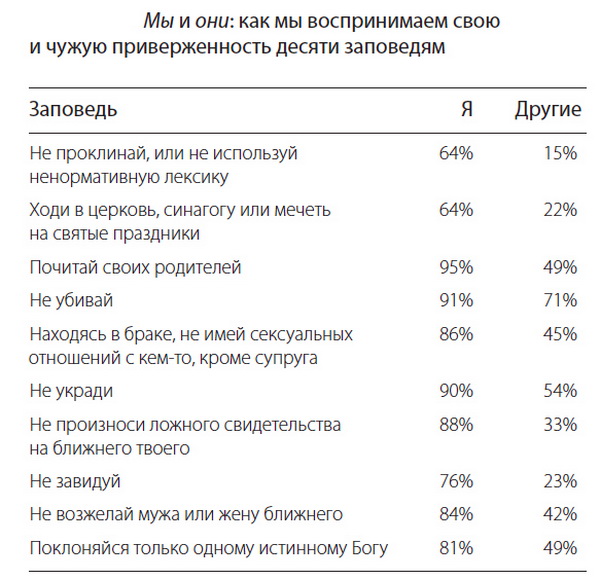 Еще в 1980-х респондентов спросили, готовы ли они соблюдать десять заповедей, а затем попросили предположить, какой процент американцев поступил так же.